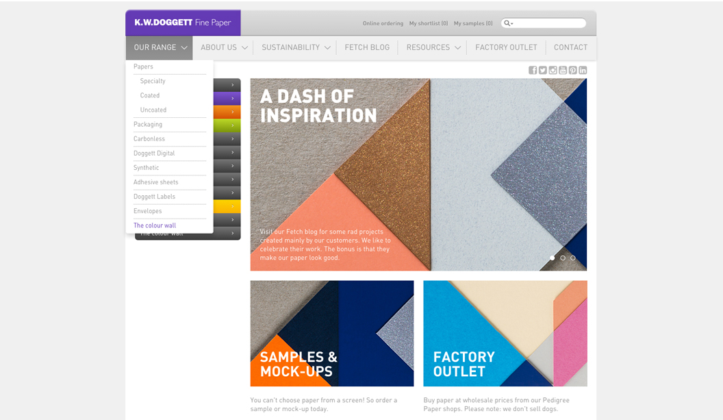 The colour wall in all its glory can be found in the ‘Our resources’ section of the website. And when you’re browsing for papers in the ‘Our range’ section, you can click on the ‘View’ button to see a photo of the stock. When you’re ready to order a sample, call your local samples team or send them a request via the world wide interweb. Enjoy!